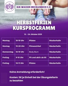 Herbstferien Kursprogramm Herbstferien-Kursprogramm bei DJK Wacker Mecklenbeck Auch in den Herbstferien müssen sportliche Aktivitäten nicht pausieren! Vom 13. bis 24. Oktober 2025 bietet DJK Wacker
