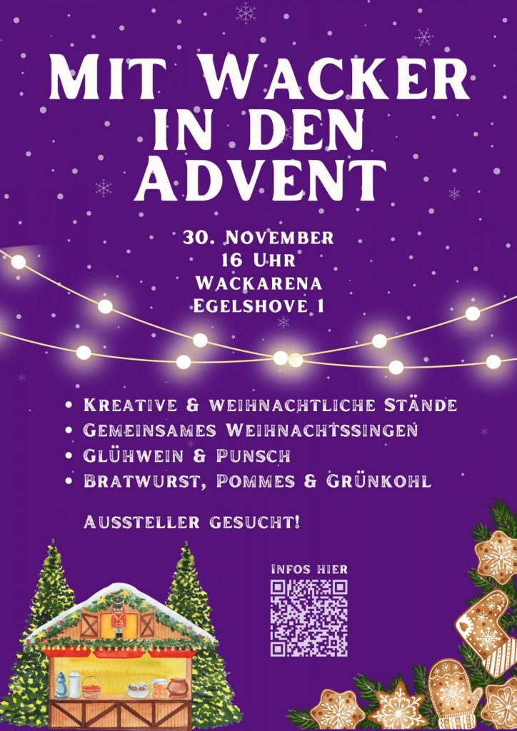 Am 1. Advent mit Wacker in den Advent!Wir laden euch am 30. November zu unserem Adventsmarkt ein. Ab 16 Uhr öffnet die Wackarena ihre Türen und verwandelt sich in ein gemütliches Winterparadies. Im Innenraum warten zahlreiche kreative und weihnachtliche Stände auf die Besucher – hier gibt es Selbstgemachtes, Dekorationen und kleine Geschenke zu entdecken.